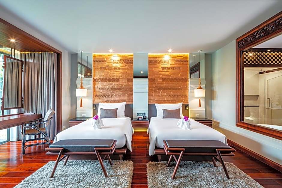 Offering additional space, the Deluxe Suite comes with a traditional Lanna-style bedroom, a separate dining area and a private balcony with a day bed. The suite also features 3 LCD TVs, set individually in the bedroom, living area and bathroom. The private bathroom comes with a spa bath, rain shower, a dressing area as well as complimentary aromatherapy toiletries.